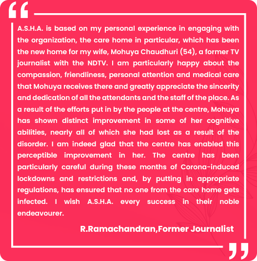 Affectionate Secured Home For Alzheimer’s or A.S.H.A. is a comfortable dementia care home for Persons with Dementia (PwD) where they are kept under the supervision of dedicated trained caregivers, coordinators and medical professionals. A.S.H.A. offers specialised dementia care to patients who are battling with this disease. It attempts to improve their quality of life and emotional well-being with a disciplined and well-researched programme that involves brain-stimulating exercises, physiotherapy, specially designed activities and most importantly personal care.