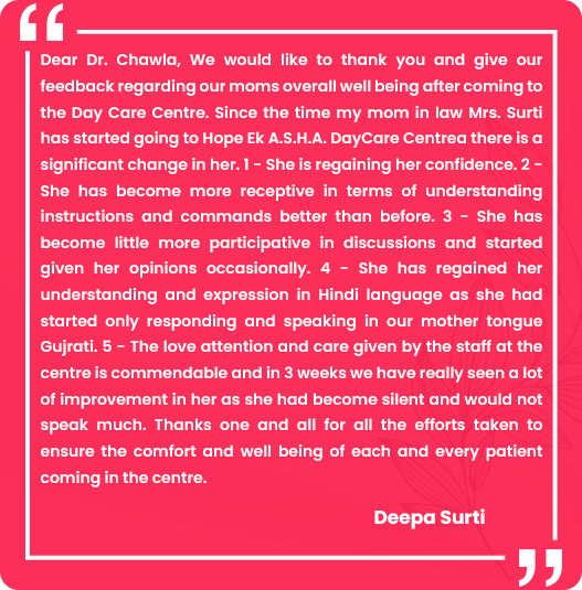 A.S.H.A. takes care of dementia patients and assists them with their daily activities. Their neuro cognitive health variables are assessed, and they are given the right assistance and dementia care to enable them to manoeuvre through life with ease. Residents are included in the A.S.H.A. Daycare, wherein they participate in activities centric to their physical, cognitive, social and spiritual well-being. The caregivers at A.S.H.A. are dedicated, trained and are equipped to handle emergencies that may occur due to cognitive impairments and memory loss among the residents.